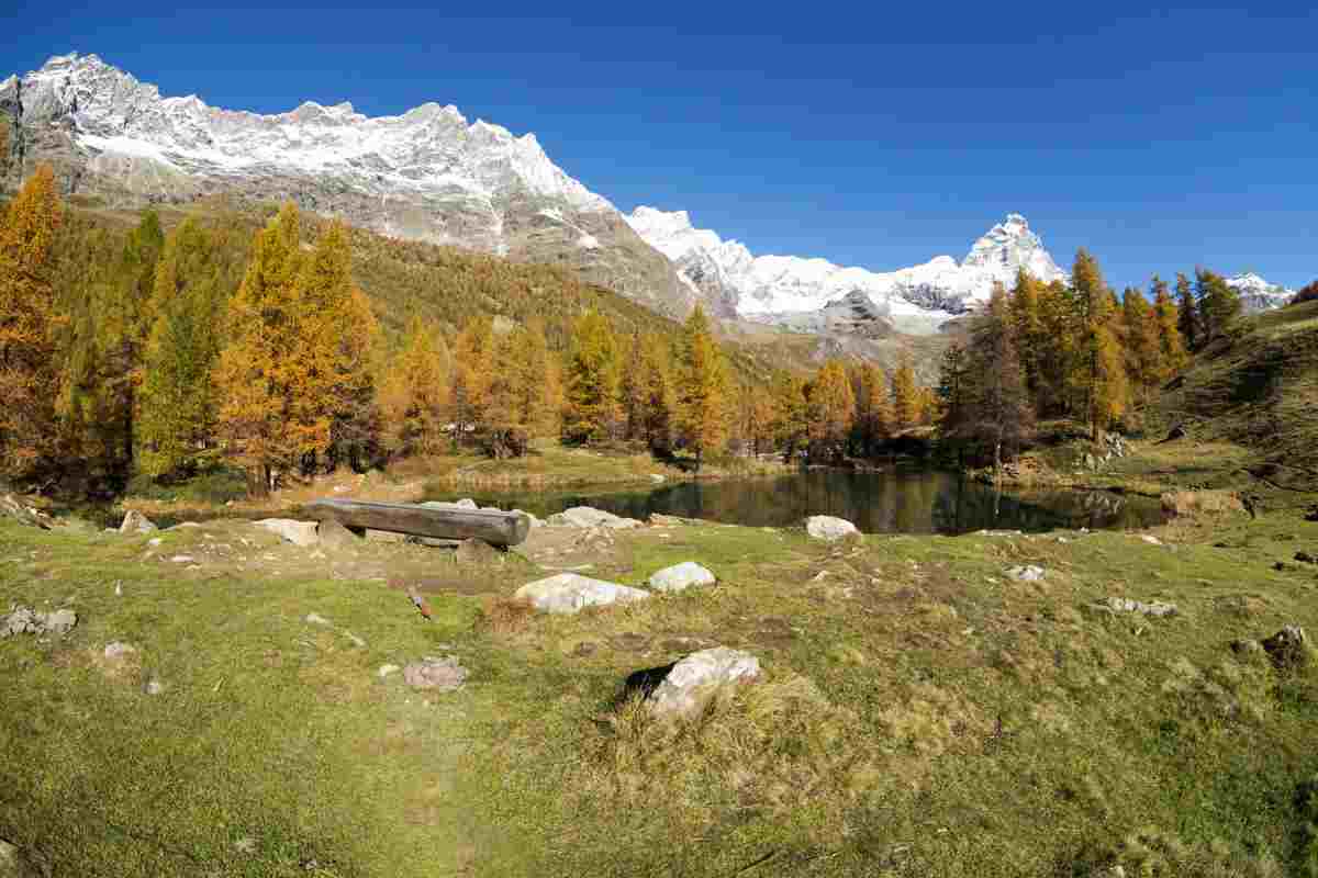 Così, ai piedi del Cervino, incastonato in una conca perfetta, quasi fosse disegnata, si trova uno dei laghi più fotografati e amati dell’intera Valle d’Aosta. Il suo nome evoca già meraviglia e in autunno diventa uno specchio turchese che riflette le montagne e larici dorati che lo circondano.
